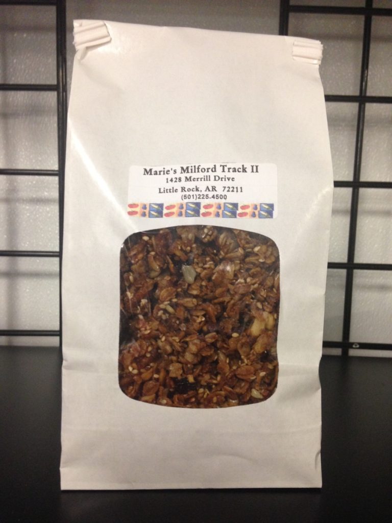 Marie’s is now offering granola everyday, not just at Thanksgiving and Christmas (remember that?) Our granola is chocked full of rolled oats, coconut, raisins, cranberries, nuts, wheat germ, sunflower seeds, sesame seeds, honey, molasses, vanilla and other yummy things. Cooked to a golden brown it’s great on oatmeal, yogurt, as a cereal, cooked in pancakes, cookies, brownies etc. or right out of the bag. Try some!